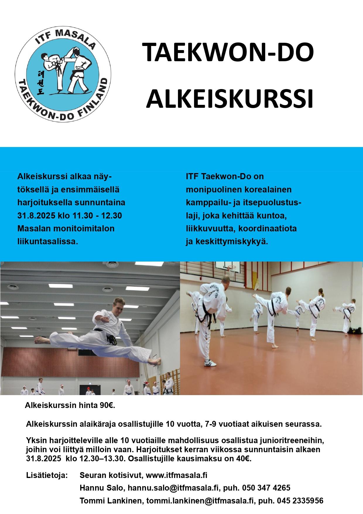 ITF Masalan alkeiskurssi alkaa näytöksellä ja ensimmäisellä harjoituksella sunnuntaina 25.8.2024 klo 11.30 - 12.30 Masalan monitoimitalon liikuntasalissa (Puolukkamäki 7). Otamme uusia mukaan alkeiskurssille kuukauden ajan ensimmäisen harjoituksen jälkeen.