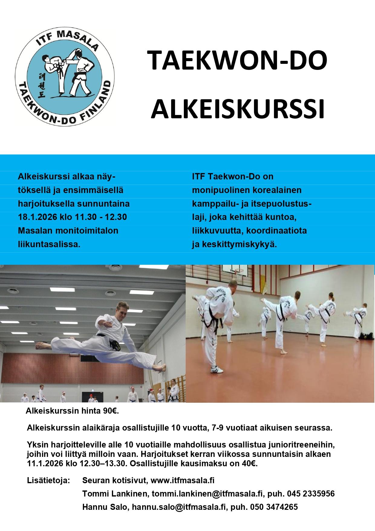 ITF Masalan alkeiskurssi alkaa näytöksellä ja ensimmäisellä harjoituksella sunnuntaina 18.1.2026 klo 11.30 - 12.30 Masalan monitoimitalon liikuntasalissa (Puolukkamäki 7). Otamme uusia mukaan alkeiskurssille kuukauden ajan ensimmäisen harjoituksen jälkeen.